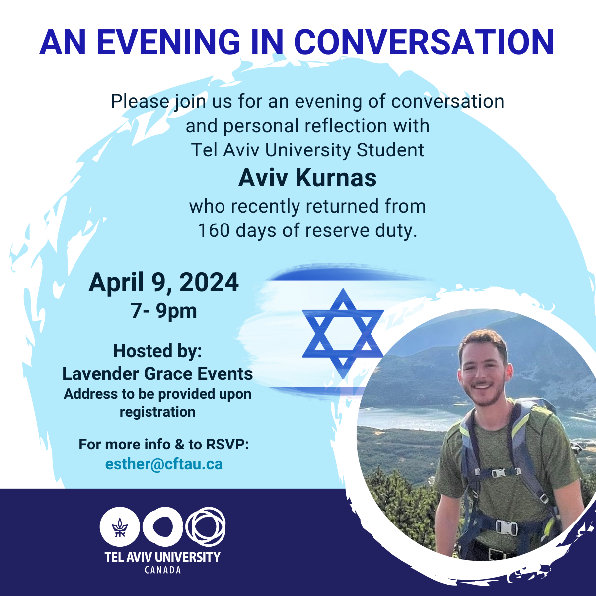 with Please join us for an evening of conversation and personal reflection with Tel Aviv University Student Aviv Kurnas, who recently returned from 160 days of reserve duty. April 9, 2024 |7-9pm Hosted by: Hosted by: Lavender Grace EventsAddress to be provided upon registration Please support TAU’s Uniform to University Fund! For more info: Ilona […]