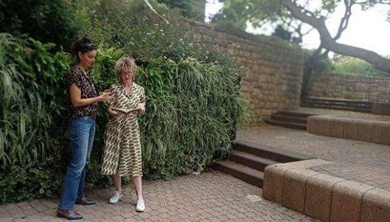 Students hanging out in the Naftali garden surrounded by its green walls